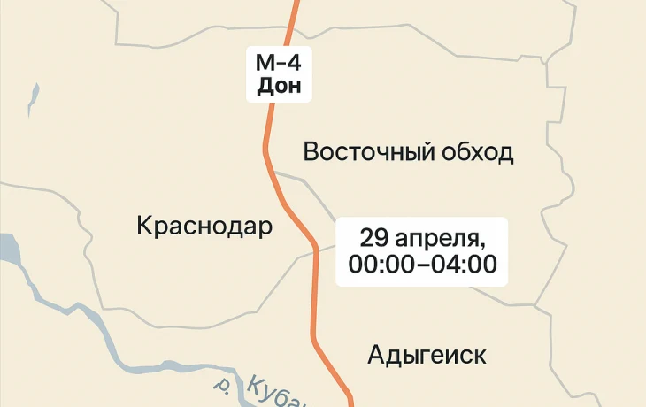 Второе ограничение ожидается в ночь на 30 апреля 2025 года. На этот раз движение перекроют на 1327-м километре трассы, в зоне Восточного обхода Краснодара. Временные остановки также будут организованы ночью, чтобы минимизировать неудобства для автомобилистов.